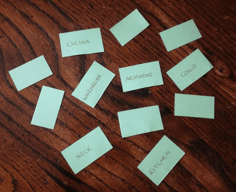 Per farlo abbiamo bisogno di un cartoncino colorato in cui tagliare tanti pezzetti: su metà di essi si scriveranno le parole in lingua, sull'altra metà i significati.