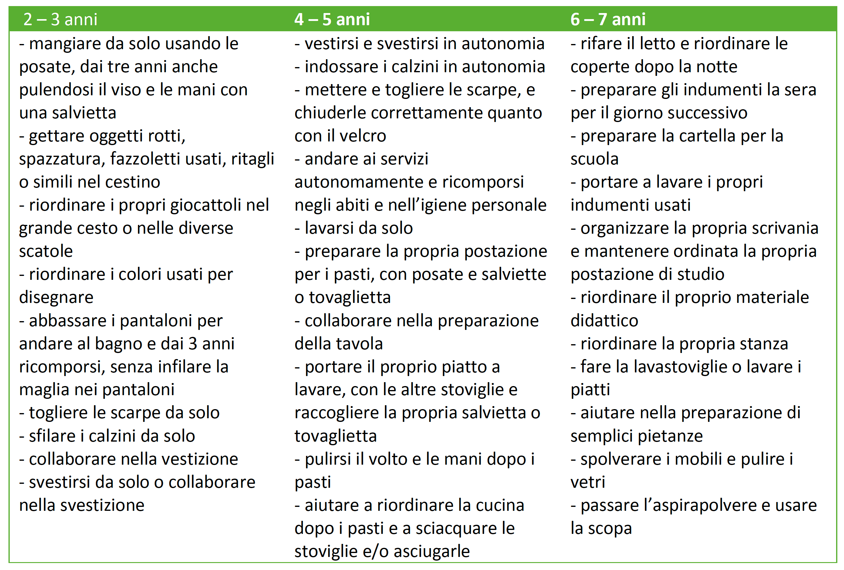 Si tratta di apprendere le autonomie compatibilmente con la propria età, favorendo sempre lo spunto verso un gradino più in alto. Questo mese, per esempio, il vostro bambino di tre anni può aver imparato ad aiutare nella preparazione della tavola, il prossimo passo può essere rappresentato dal richiedergli un piccolo compito nello riordinare la tavola dopo il pasto.