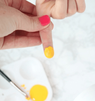 Una volta che la vernice si è asciugata completamente, immergi il pollice nella vernice gialla coprendo completamente il dito di colore e premi delicatamente sulla base bianca per creare il corpo dell’ape, usa il pennello per coprire eventuali buchi se necessario;