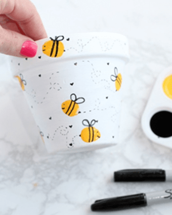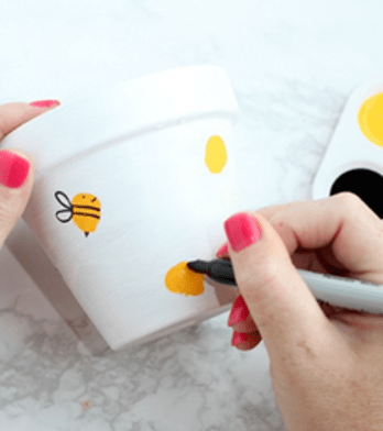 Una volta che la vernice gialla si sarà asciugata usa il pennarello nero per completare il corpo delle api;