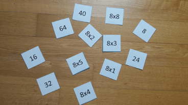 Suddividete i cartellini in due gruppi di uguale numerosità, su un lato dei cartellini del primo gruppo scrivete la moltiplicazione da calcolare, nei cartellini del secondo gruppo invece scrivete i vari risultati.