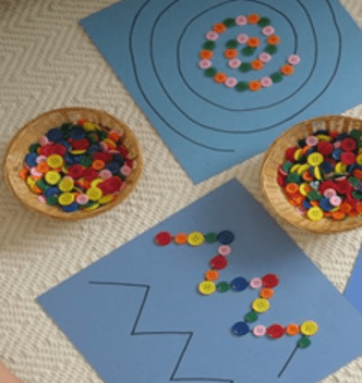 - La pressione a pinza che i bambini utilizzano per raccogliere e posizionare i bottoni sulla carta sarà utile per lo sviluppo della corretta impugnatura di matita e penna e per l’acquisizione della scrittura