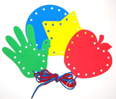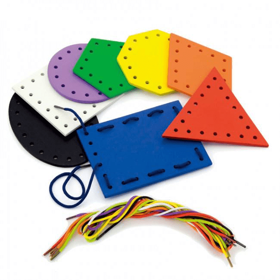 -si possono allenare i bambini a riconoscere e denominare forme e colori, utilizzando per ogni forma il laccio del colore corrispondente.